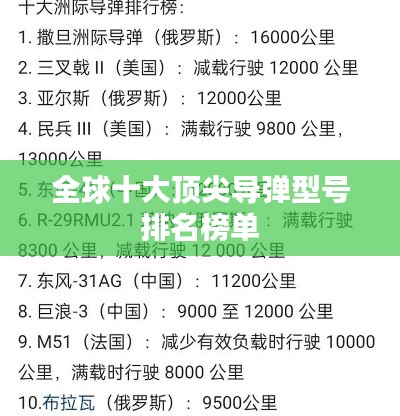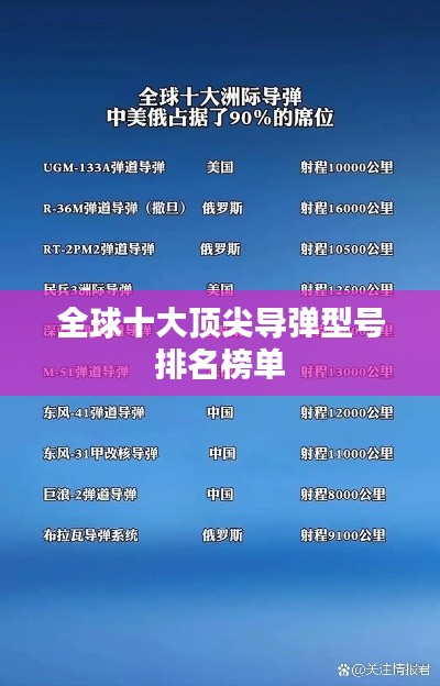随着科技的进步和军事领域的持续发展,导弹已成为各国国防力量的重要组成部分,本文将为您介绍全球导弹型号排名前十名,这些导弹各具特色,代表了当今世界导弹技术的最高水平。
